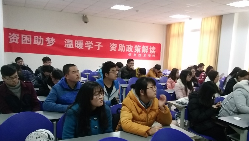 为了响应学校“资助政策宣传月”系列活动,让更多学生深入了解我校资助政策并饮水思源,信息技术学院于201512月开展了以“资困助梦、温暖学子”为主题的弘志社资助政策解读活动,活动对象为信息技术学院全院本科学生。