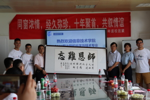 6月23日下午1时30分,在信息技术学院会议室举办2009届计算机科学与技术专业毕业10周年返校团聚活动。胡孔法院长、蔡爱华书记、翟双灿老师、沈静老师与同学们共聚一堂,话荏苒时光,追青春岁月,忆师生情长。