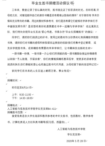 读书,能够开阔我们的眼界,浸润我们的心灵,鼓舞我们的斗志,陶冶我们的情操。为了让书籍点亮人生,5月下旬,人工智能与信息技术学院学生党支部发起毕业学姐学长捐赠图书活动倡议,以书为伴,以书为友,让书香流淌在我们的心田。