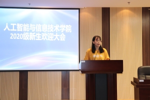 教师代表人工智能教研室主任龚庆悦老师与新生分享了一些感悟,希望同学们能静下心来读书,树立正确的认知和良好的愿望,脚踏实地的去行动,相信良好的“境”、扎实的“行”,一定可以产生丰硕的“果”。她勉励同学们勤奋好学、认真做事、不急功近利、厚积而薄发,勇于挑战,成就优秀的自己。老生代表院学生会主席17计算机科学与技术班田妞妞学姐通过自身经历给各位学弟学妹们提了几点建议,提醒他们要制定计划、学会学习、学会生活、要大胆实践,用积极的心态来经营自己的生活。