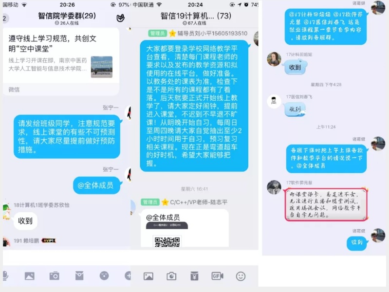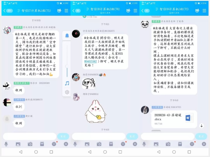 辅导员老师早早制定了《学生线上课堂行为规范》,并请同学们参照执行,保证课堂秩序;关注同学们的情绪和作息,制作线上学习相关推送,鼓励同学用心学习,提前调整作息和心态。要求班长提前清点班级教学用群,做到所有同学实名,清退非本班同学,提醒同学们按时上课,请学委作好考勤。此外,辅导员还及时收集对线上教学意见反馈,为老师改进线上教学提供参考。