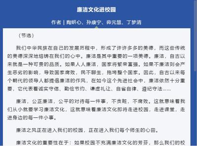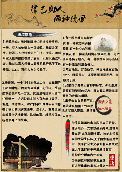 为深入学习党风廉政建设制,学习宣传党规党纪,树立良好师德师风,抵制不良学术之风,营造风清气正的氛围,我院学生党支部开展了“廉洁文化进校园”的主题活动。由支部书记指导,各党员自由组队,完成一个廉洁文化作品。