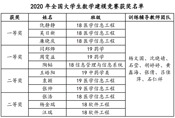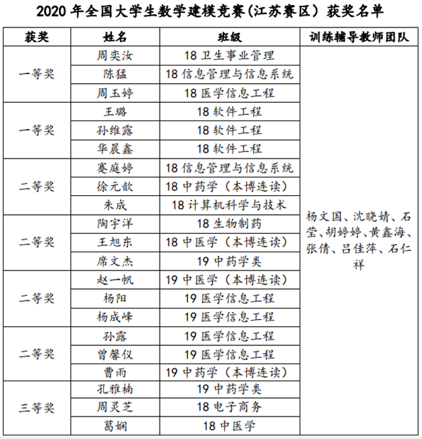 全国大学生数学建模竞赛创办于1992年,是目前全国高校规模最大的基础性学科竞赛和世界上规模最大的数学建模竞赛,也是首批列入中国高等教育学会“高校学科竞赛排行榜”的19项重大赛事之一,同时也是国家“双一流”和江苏高水平大学人才培养质量的考核指标之一。我校自2013年参加该项赛事以来,从学校到学院再到教研室,一直致力于数学建模师资队伍与赛教一体化建设,通过八年的一以贯之,久久为功,参赛成绩终于取得了突破,期望以本次竞赛为新的起点,“以赛促教、以赛促学、学赛结合”,继续完善具有我校特色的高等数学教学模式,构建优化高等中医药院校数学教学体系,力争成为全国医药院校数学建模的标兵,为培养具有团队精神和创新能力的高素质人才做出更大贡献。