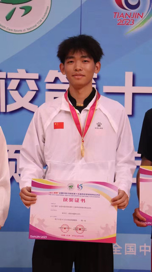 在体育竞赛方面,他刻苦训练,积极投身各种传统武术比赛,顽强拼搏,勇于挑战。连续两年在学校武术队代表学校参加竞赛,在江苏省第二十届运动会中一举夺得男子太极拳金牌、男子太极剑铜牌以及高校部体育道德风尚奖等三个省级奖项。并在“达仁堂杯”全国中医药院校第十五届传统保健体育运动会中摘得“太极拳”“太极拳竞赛套路”“太极剑竞赛套路”三项金牌!创造了学院的历史之最,为我校争金夺银赢得荣誉。
