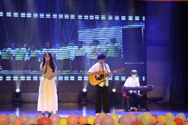 伴随着经典的前奏的响起,“再把金樽话旧朝篇章”开始了。2021级医学信息工程班的混声合唱《夜空中最亮的星》和谐统一,激励着大家勇敢追梦,全场观众都情不自禁地跟唱。熟悉的旋律在舞台上响起,每一个音符仿佛都有魔力,2023级人工智能班带来《动画回忆录》歌舞串烧,带我们回到了无忧无虑的童年时光。舞台灯光柔和,营造出温暖的氛围,熟悉的旋律再次响起,2020级软件工程班献上大合唱《后来》,温暖而深情,全场同声共唱,生动诠释了原来大学就是“四首后来的时间”。