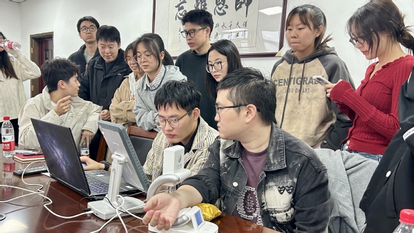 中医学院研究生党支部成员体验了智能诊断仪——舌面诊仪和脉诊仪,并与人工智能与信息技术学院研究生党支部成员进行深入交流。
