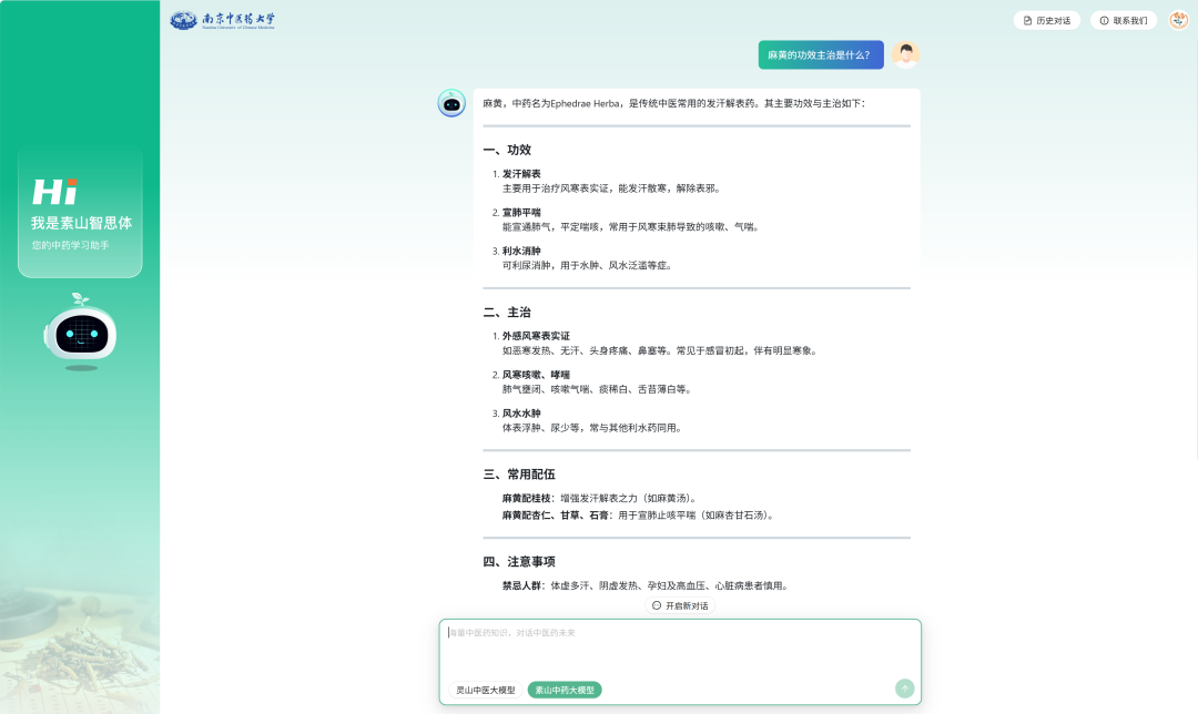 “素山中药大模型(素山智思体)”依托南京中医药大学中药学国家一流学科、江苏省首批省级人工智能学院等平台优势,整合《中药大辞典》《中医方剂大辞典》和古今文献资料、网络药理学数据等;通过自研中医知识推理思维链和自适应语义理解引擎,攻克中药学显性和隐性知识抽取、表示和解析。构建生成式人工智能中药学专用大模型服务平台,推进中药学教学和科研向数字化和智能化转型,为中药学优势学科建设、中拔尖创新人才培养等提供强力支撑。