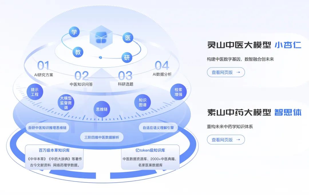 “灵山中医大模型(小杏仁)”依托南京中医药大学专业的中医数据资源,构建中医知识智能体,汇聚了2000多部中医典籍与名家医案数据库,构建亿token级的中医药垂直领域数据集,通过“三阶四维”数据治理体系实现高质量的中医数据解析;通过自研中医知识推理思维链和自适应语义理解引擎,实现中医显性和隐性知识抽取、表示和解析,构建集中医知识问答、科研选题、研究方案生成、数据分析等功能于一体的中医智慧平台,以满足中医临床、教学、科研等多场景需求,实现助学、助教、助研、助医等功能,赋能中医药高质量发展。