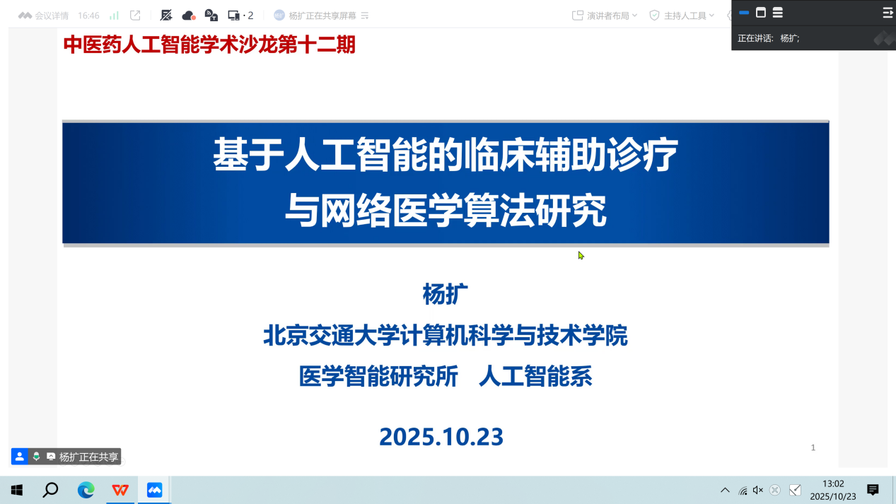 2025年10月23日,由江苏省智慧中医药健康服务工程研究中心、中国中医药信息学会人工智能分会、南京中医药大学人工智能与信息技术学院联合主办的第十二期中医药人工智能学术沙龙于线上举行。此次学术沙龙特邀请北京交通大学计算机科学与技术学院人工智能系教师杨扩,做了题为“基于人工智能的临床辅助诊疗与网络医学算法研究”的学术报告,学院教师和研究生参加本次活动。活动由副院长杨涛主持。