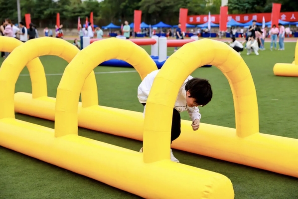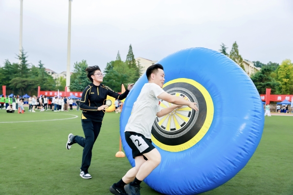 除了竞技项目的紧张激烈,趣味赛场同样热潮涌动。超级障碍赛中,师生携手过关,共同为荣誉拼搏;旱地龙舟上,动作行云流水、整齐划一,一往无前;八仙过海中,大家齐心协力,笑声与欢呼声此起彼伏;无敌风火轮中,师生互相鼓励,默契配合,将圆盘推向胜利终点,震耳欲聋的呐喊声将赛场气氛推向顶峰。
